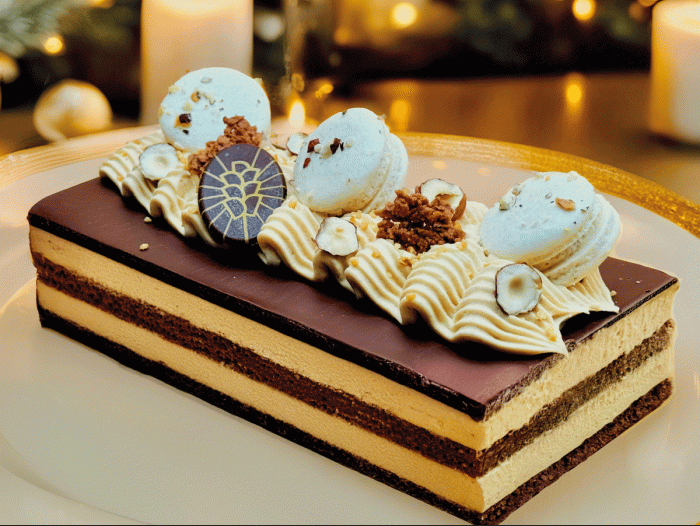 Composée de génoise au chocolat fondante et de mousseline pralinée aux noisettes elle est garnie d’une ganache au chocolat noir au praliné grain délicatement croquant.